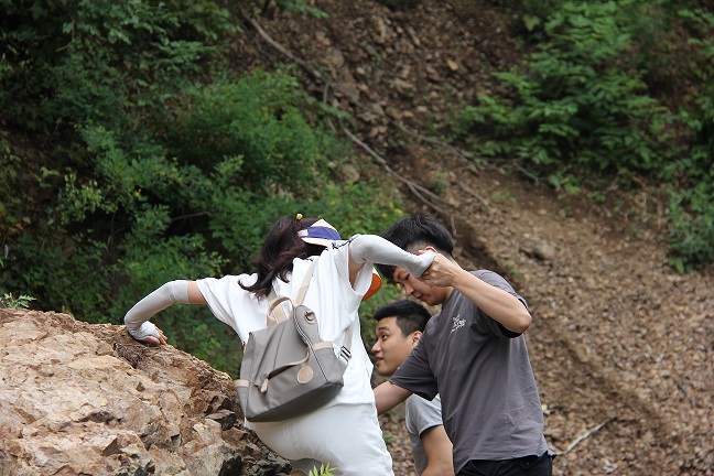 谷里的懸崖、山峰、山鉤、緩坡交錯分布,面對登山挑戰,為了不讓家人們掉入水中,男士們直接站在水中,幫助家人們經(jīng)過(guò)險地。最終,我們戰勝了陡峭,戰勝了身體的疲勞。不但經(jīng)受了自我身體素質(zhì)的考驗,更加體會(huì )了相互幫扶協(xié)作力量的強大。