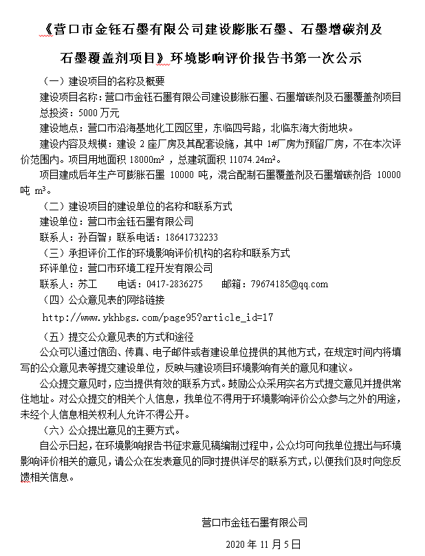 《營(yíng)口市金鈺石墨有限公司建設膨脹石墨、石墨增碳劑及 石墨覆蓋劑項目》環(huán)境影響評價(jià)報告書(shū)第一次公示