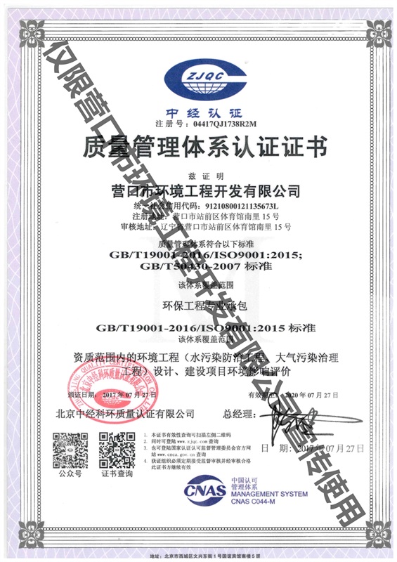質(zhì)量管理體系認證證書(shū)-資質(zhì)榮譽(yù)-營(yíng)口市環(huán)境工程開(kāi)發(fā)有限公司