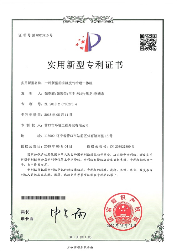 一種新型的有機廢氣治理一體機-科研專(zhuān)利-營(yíng)口市環(huán)境工程開(kāi)發(fā)有限公司