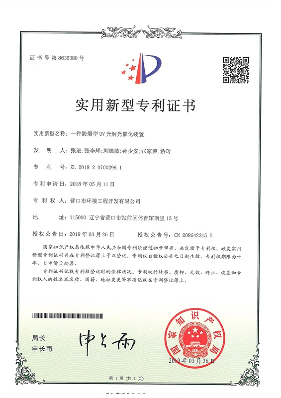 一種除爆型UV光解光催化裝置-科研專(zhuān)利-營(yíng)口市環(huán)境工程開(kāi)發(fā)有限公司