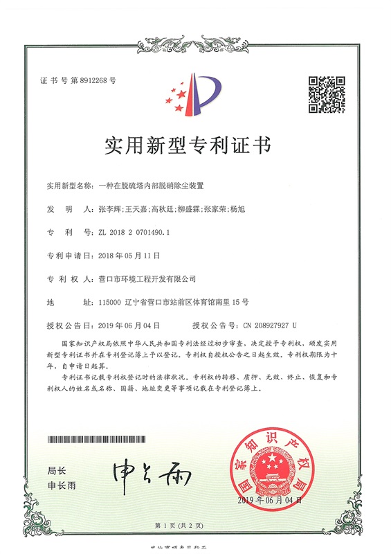 一種在脫硫塔內部脫硝除塵裝置-科研專(zhuān)利-營(yíng)口市環(huán)境工程開(kāi)發(fā)有限公司